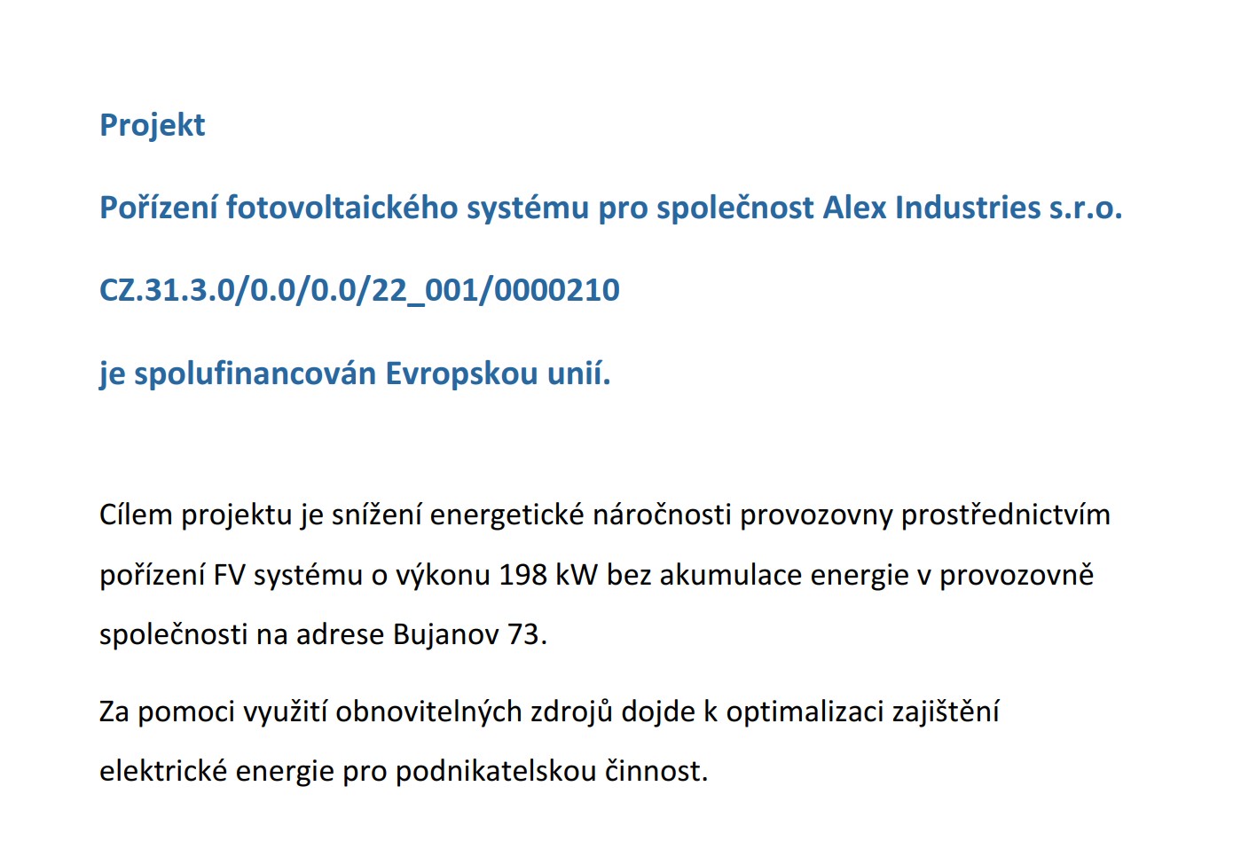 Pořízení fotovoltaického systému pro společnost Alex Industries s.r.o.