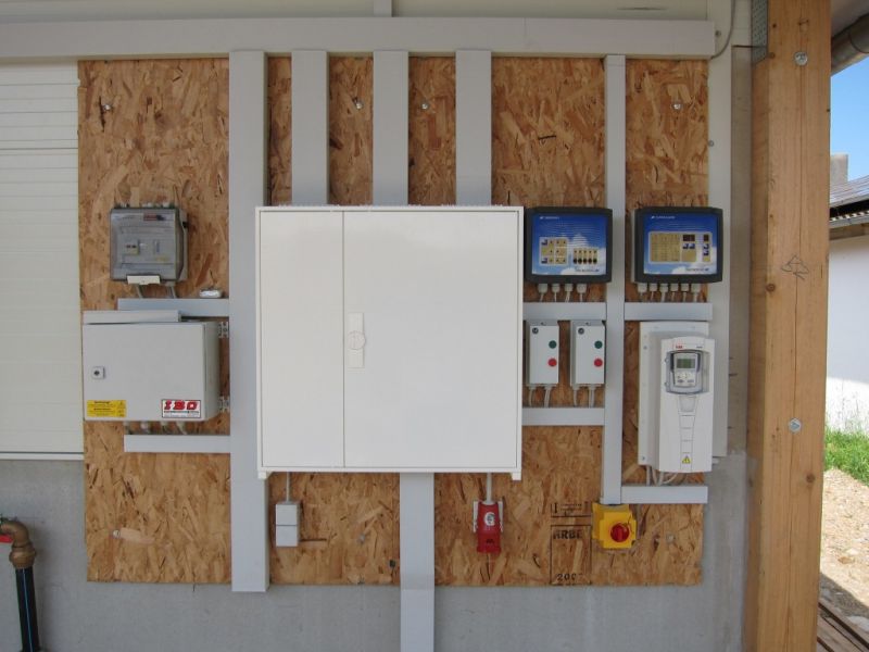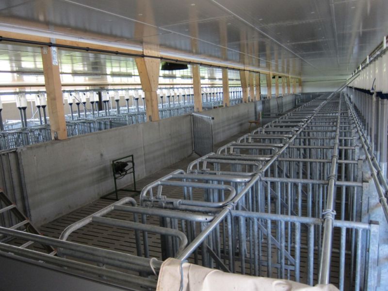 Kombinierter Warte- und Deckstall mit 160 Korb-Kastenständen, 30 Plätzen in Gruppenbuchten sowie 2 Eberbuchten. Trockenfütterung mit 2 Futtersorten, Abluft mit frequenzgeregelten 3ph. Ventilatoren.