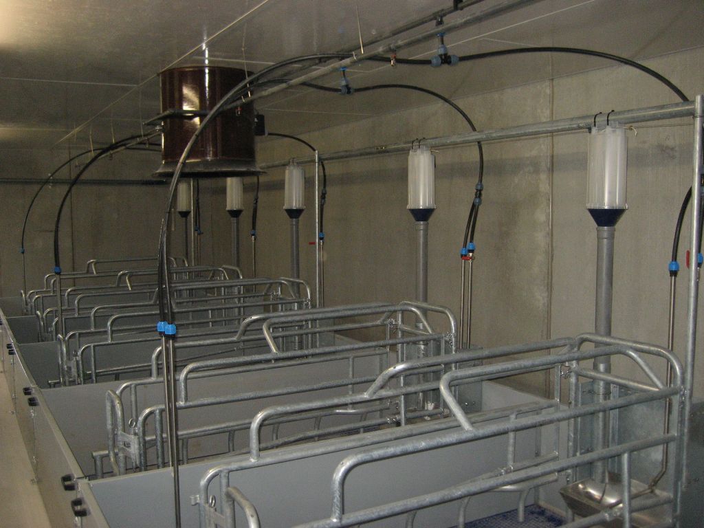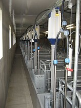 Bräuer Abferkelbucht mit Dreikantkosten und Betonplatte im Sauenbereich, tierfreundliches Nooyen-Rostsystem im Ferkelbereich, elektrisch beheizten Heizplatten zum Einlegen sowie 60er Trockenfütterung.