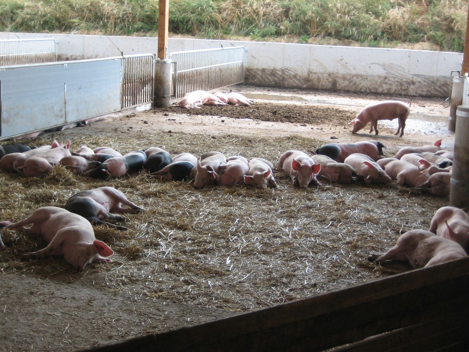 Schweinemaststall mit sehr großem Auslauf auf Stroh für die Tiere.