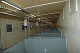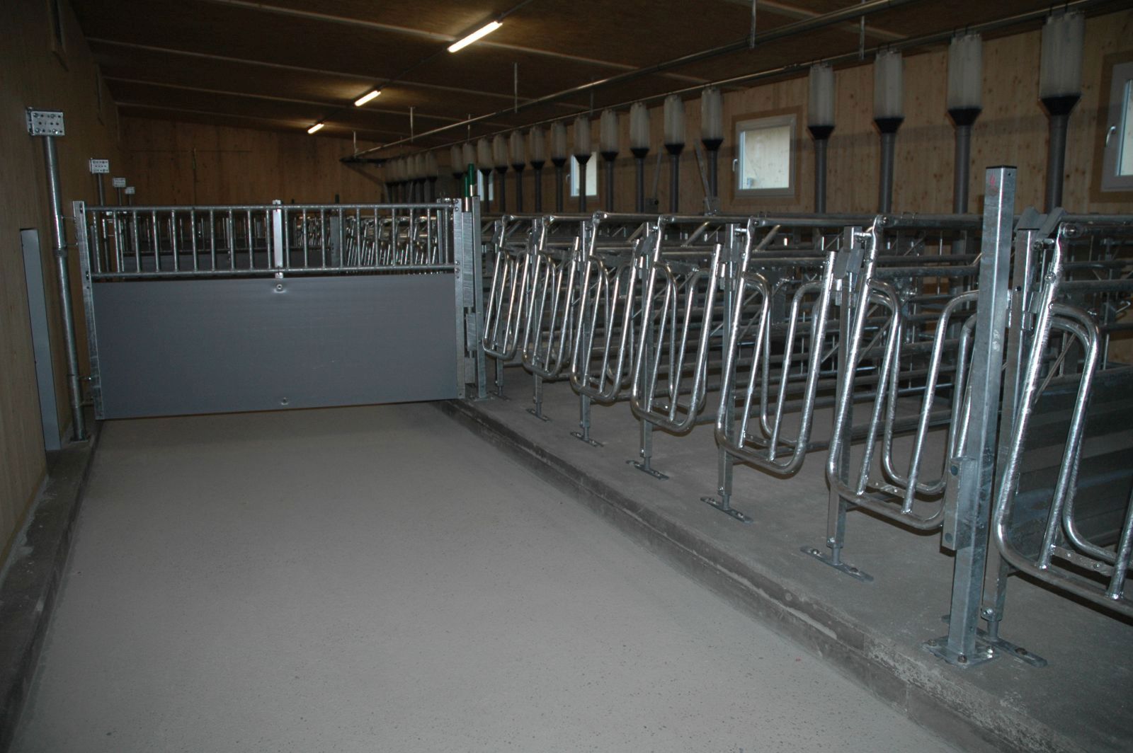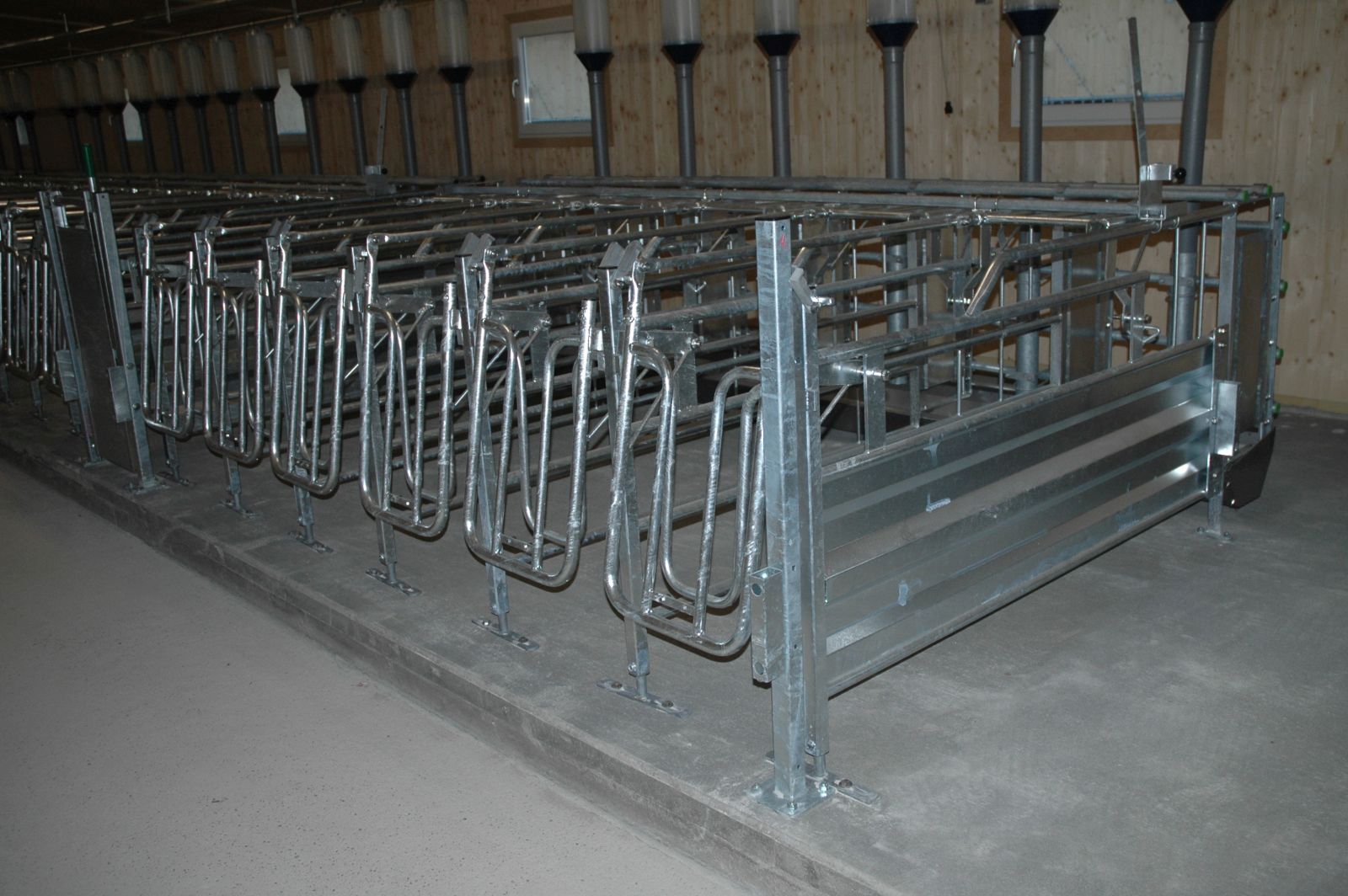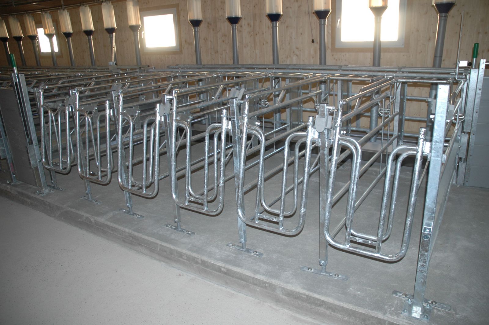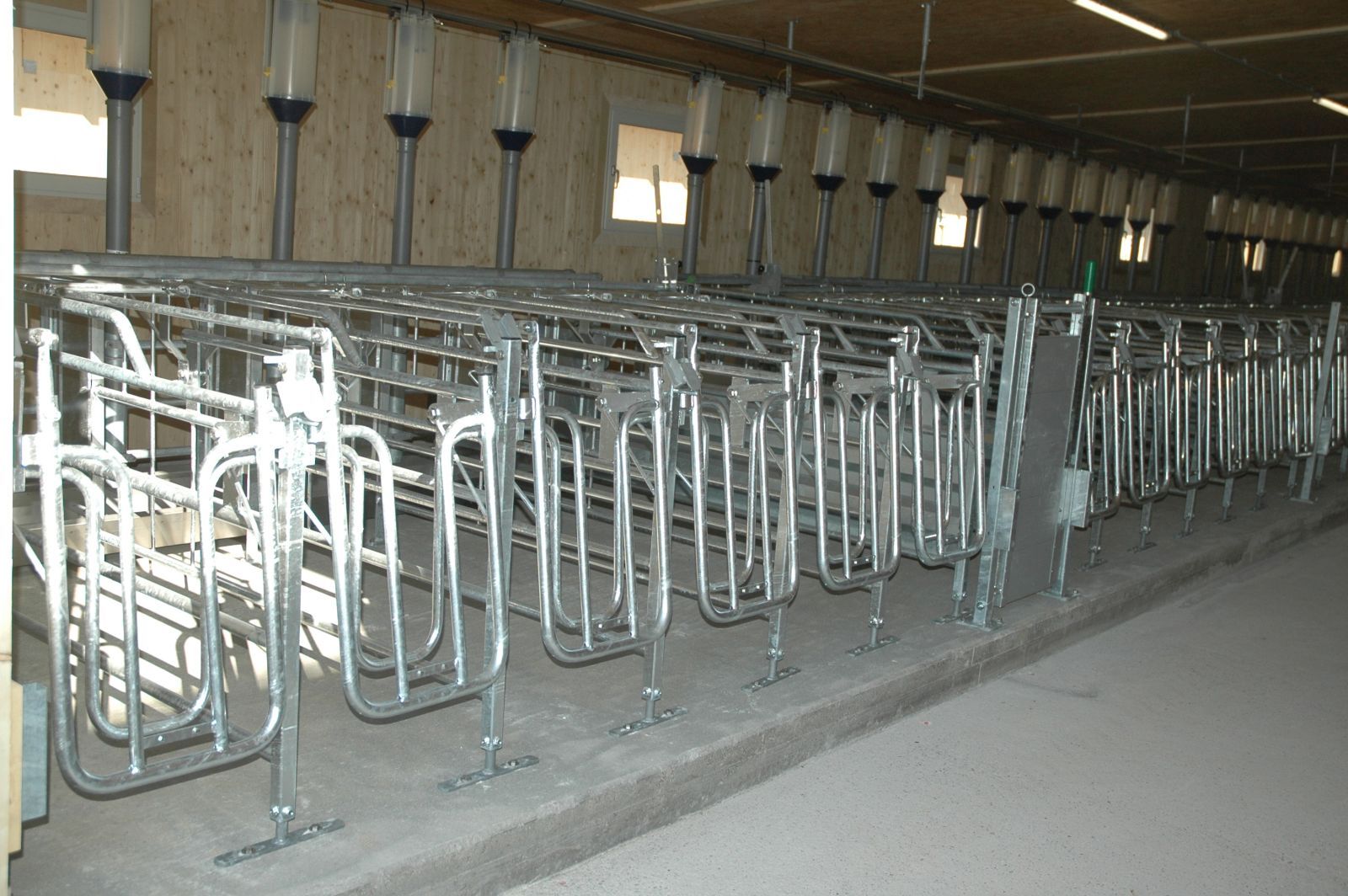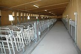 Bräuer PigFair Abferkelbuchten, Selbstfangkastenstände mit Besamungswippe. Fütterung mit Weda Drycomp Trockenfütterung.
