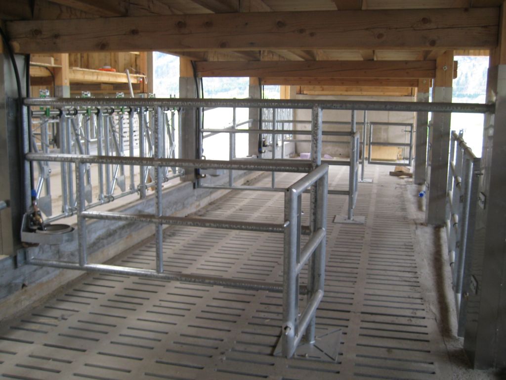 Beef housing with solid separation gratings and integrated doors, self-locking feed fences 2 inches. All separation fences and tele-doors with integrated recess for the watering unit. The drinking units are optimally protected from damage as a result.